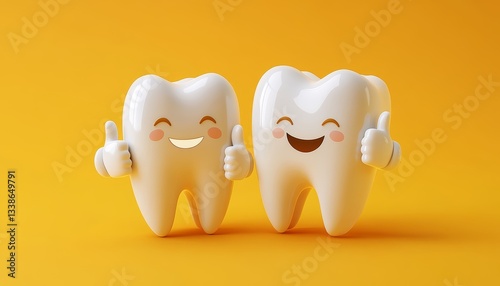 3D Happy White Teeth Giving Thumbs Up On Bright Yellow Background With Faces For Healthcare