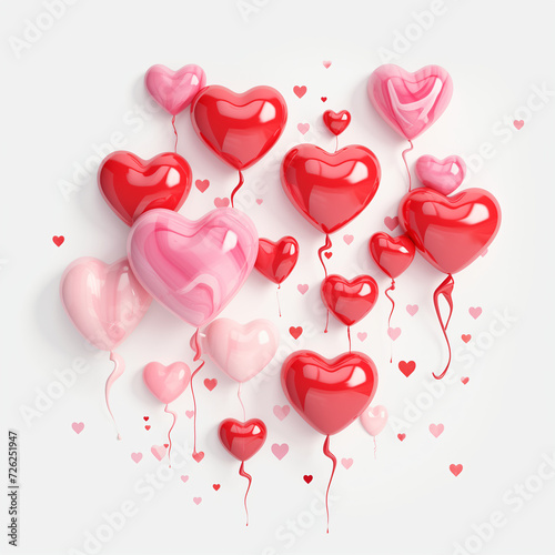 3D hearts, in shades of red and pink, on white background. When popped, the balloons splash red and pink paint on the background.