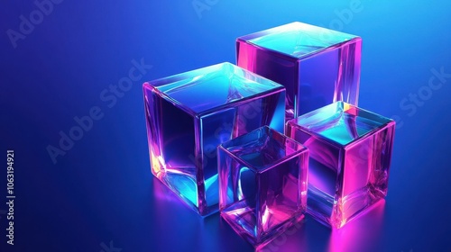 3d holographic abstract cube, crystal blocks with holographic purple color texture. 3d vector illuctration isolated on blue background.