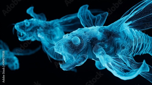 3D holographic rendering of deep-sea fish in glowing blue wireframe, symbolizing futuristic marine biology and sci-fi creature design