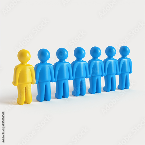 3D human figure leading the way, line of people following with one in different color, clip art style.