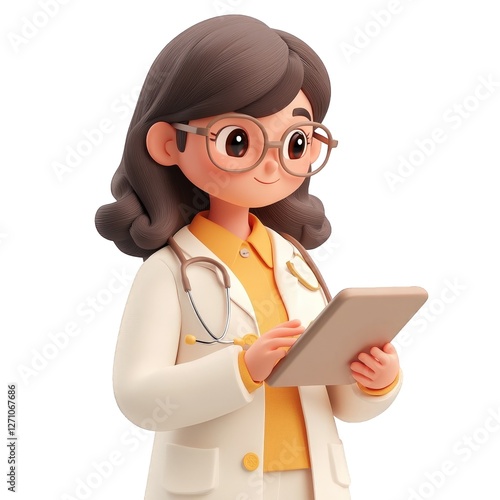 3d icon Female doctor wearing glasses, holding tablet and stethoscope, representing medical professional working with digital technology on transparent background
