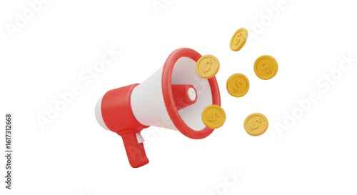 3d icon of a red and white megaphone announcing with gold coins flying out isolated on transparent background