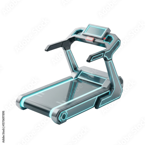 3d icon of a sleek, futuristic treadmill with glowing blue accents, showcasing modern fitness technology and design isolated on transparent background