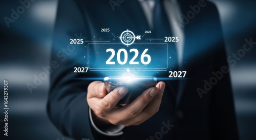 3d icon of businessman holding a digital display showing the year 2026 and future projections