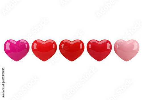 3d icon of group of five shiny glossy 3d hearts in red and pink isolated on transparent background for love and romance