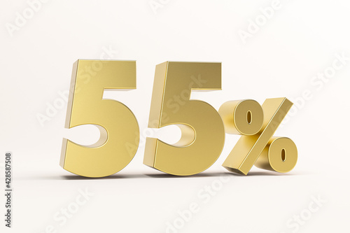 3D illustration fifty five percent golden isolated on white background. 3D rendering for advertising. 55% off on sale.