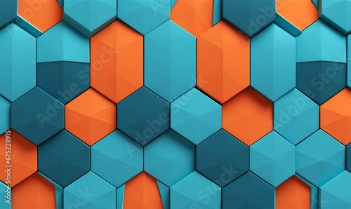 3D illustration. Geometric seamless 3D pattern in azure and orange colors shapes. Hexagon geometric mosaic, Generative AI