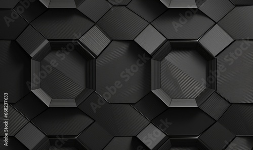 3D illustration. Geometric seamless 3D pattern in black matte and black glossy material elements. Hexagon geometric tiles, Generative AI
