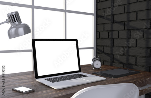 3D illustration laptop and work stuff on table near brick wall, Workspace