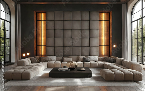 3D Illustration Modern Living Room Interior Design with Modular Sofa, Coffee Table, Rug, and Ambient Lighting