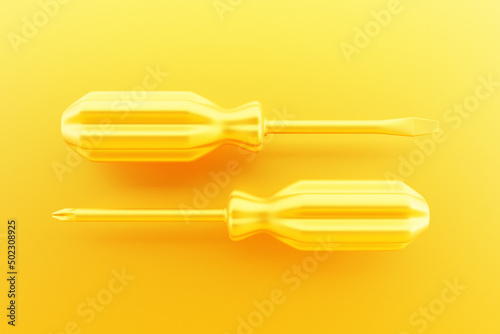 3D illustration of a yellow screwdrivers in cartoon style on a monochrome isolated background. Hand carpentry tool for DIY shop.