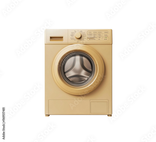 3D illustration of a beige washing machine featuring buttons and a front-loading door. Suitable for home appliance and laundry-related visuals. Isolated on transparent background, png