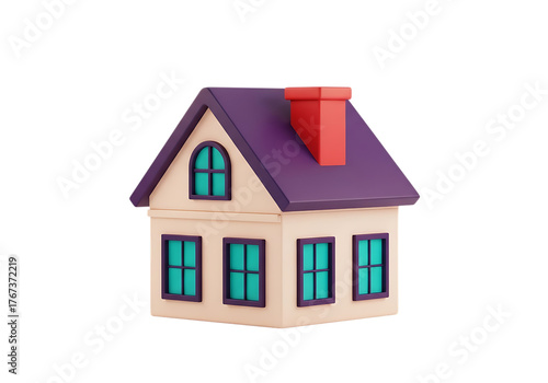 3d illustration of a charming cartoonstyle house with a purple roof and red chimney, isolated on transparent background on transparent background