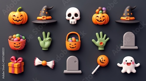 3D illustration of a collection of cute, colorful Halloween icons, each neatly arranged in a grid on a dark background. The icons include a pumpkin with a witch hat, a white skull, a jack-o'-lantern,
