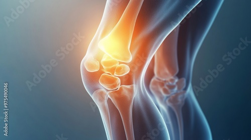 3D illustration of a human knee joint with highlighted pain area. Medical and healthcare concept
