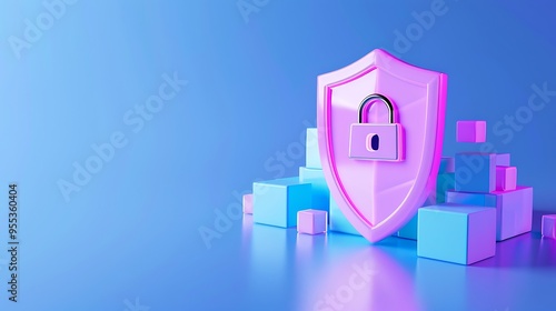3D illustration of a pink shield with a padlock on abstract blue blocks, representing data security and protection.