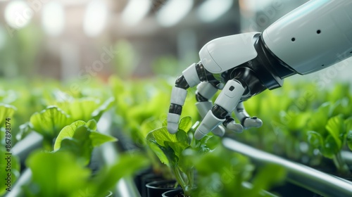 3D illustration of a robotic arm interacting with green plants in a controlled environment.