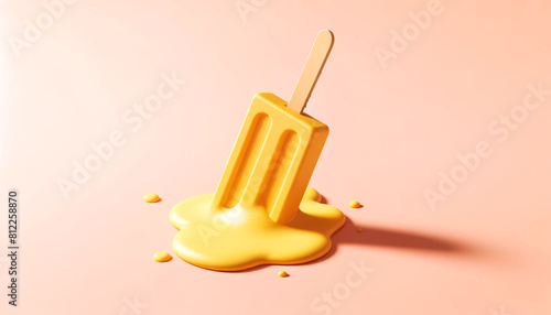 3D illustration of a yellow popsicle melting into a puddle, set against a soft pink background.