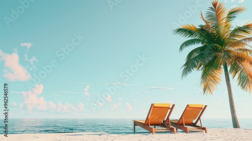3D illustration of beach loungers on a sunny shore, framed by palm trees. Open space for text, perfect for a summer vacation concept.