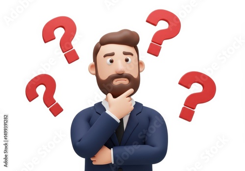 3D Illustration of Cartoon businessman surrounded by red question marks looking thoughtful isolated on white background