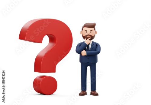 3D Illustration of Cartoon man in a suit standing next to a large red question mark looking thoughtful isolated on white background