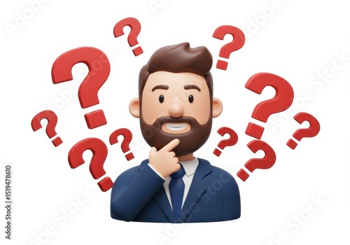 3D Illustration of Cartoon man in suit surrounded by question marks isolated on white background representing confusion and problem solving
