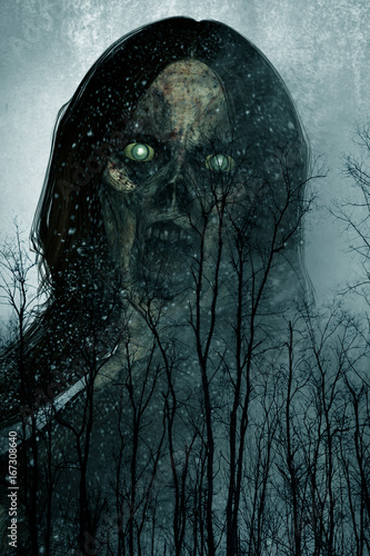 3d illustration of close up scary ghost woman in the woods,Horror background mixed media