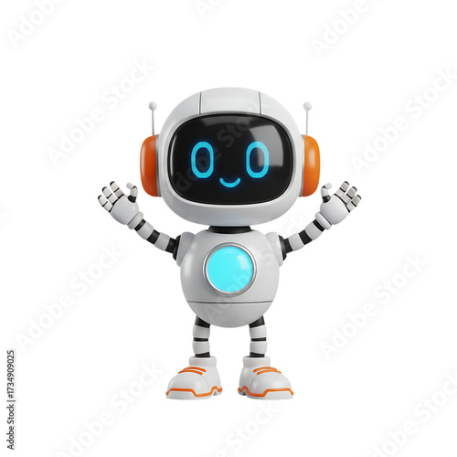3d illustration of friendly robot with orange accents isolated on transparent background, waving its arms and smiling with a glowing blue face and a glowing blue chest