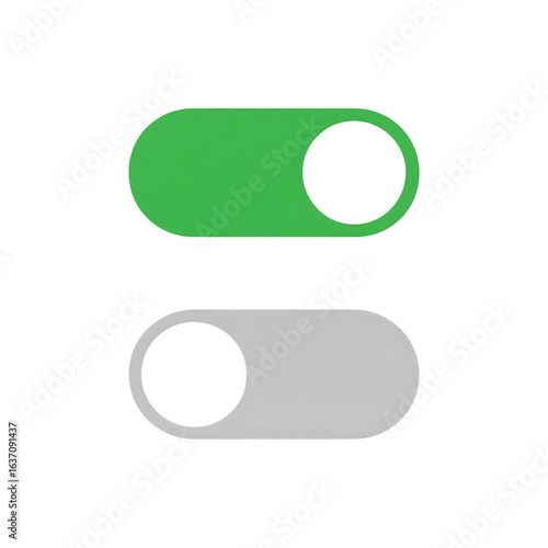 3d illustration of green and gray toggle switches isolated on transparent background, representing on and off states in a digital interface