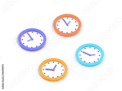 3d illustration of ixometric icons of office clocks of different colors. leaning on the floor, top view.