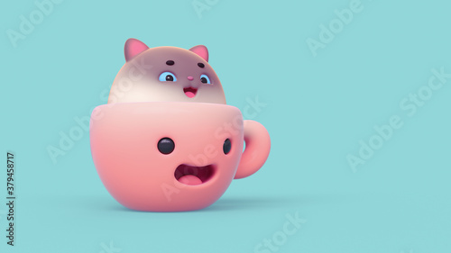 3d illustration of kawaii cacao cup with a cute marshmallow cat on blue background. Funny red cup with smiling face. Cartoon fluffy fat siamese kitten with an open mouth peeking out of a mug of tea.