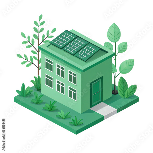 3D illustration of minimalistic green building with solar panels on roof, surrounded by plants and trees, symbolizing eco friendly architecture