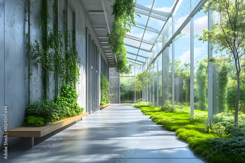 3D Illustration of Modern Building Interior with a Glass Roof and Greenery