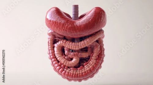 3D illustration of the digestive system including the stomach intestines and esophagus rendered in a clean simplified style Suitable for healthcare presentations nutrition campaigns and gastrointestin