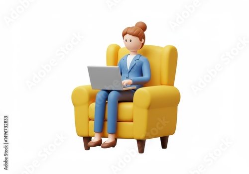 3D Illustration of Woman in blue suit sitting in yellow armchair isolated on white background