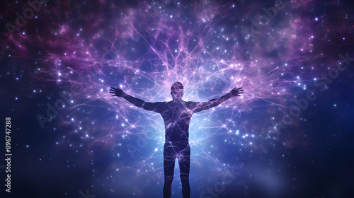 3d illustration rendering human power, resurrection, artificial intelligence, strength and wisdom combine with lightning, particles on dark background