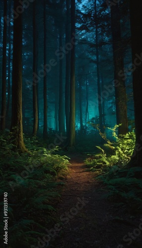 3D illustration rendering of forest image illuminated at night by bioluminescence. Ai generated image.