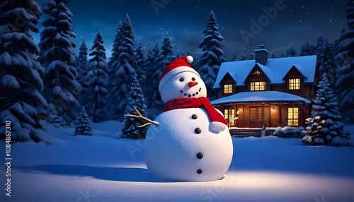 3d illustration wallpaper of snowman wearing Christmas hat with house background.