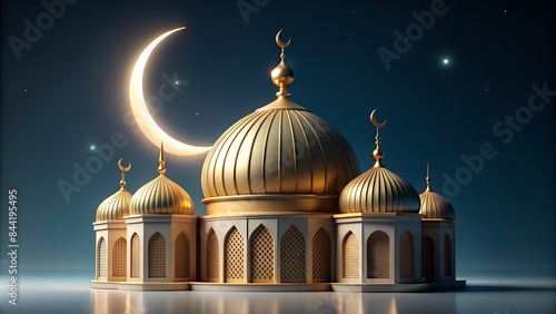 3D Islamic Dome Architecture with Crescent Moon. Perfect for: Ramadan, Raya Hari, Eid al-Adha, Islamic holiday celebrations, holiday greeting cards, festive banners, event invitations.