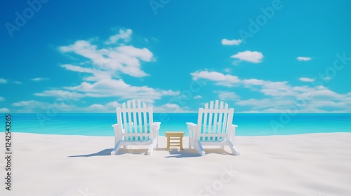 3D isometric chairs on a tropical beach with a clear blue sky, vibrant turquoise waters and soft white sand