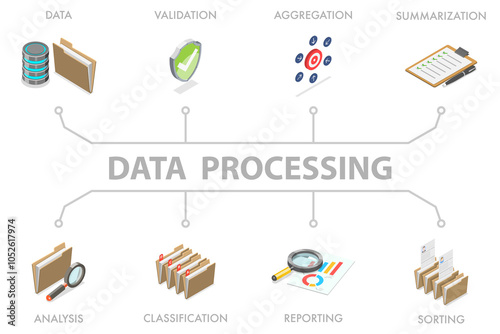 3D Isometric Flat Illustration of Data Processing, Statistics and Analytics