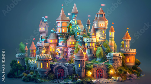 3d isometric low-poly clay medieval castle
