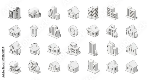 3D Isometric White Building vector icons sets Collection Houses Skyscrapers and Commercial Structures