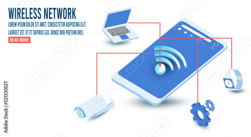 3D isometric wireless network concept with Internet of things, 5G network, smartphone router, Smart home. Vector illustration eps10