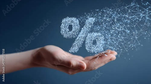 3D low-poly percent symbol held in a hand, made of triangles, lines, and dots on a blue digital background. Concept: Banking, financial calculation, discount, and digital business visualization.
