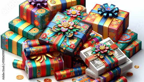 3D Macro Close up of Seollal Sebae Don Gifts concept as A macro close up of traditional sebae don (money gifts) wrapped in decorative envelopes during Seollal showcasing intricate designs and vibrant