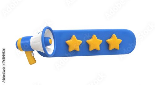 3D megaphone with three yellow stars on blue banner isolated on white background