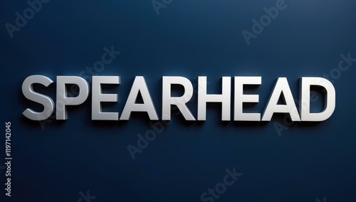3D metallic silver spearhead text on dark blue background, concept for technology branding, innovation, business strategy, futuristic design, corporate presentation, modern digital marketing backdrop