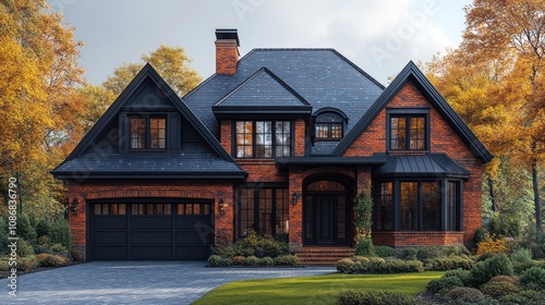 3D model of a family home with a large garage and brick detailing, on a white background.